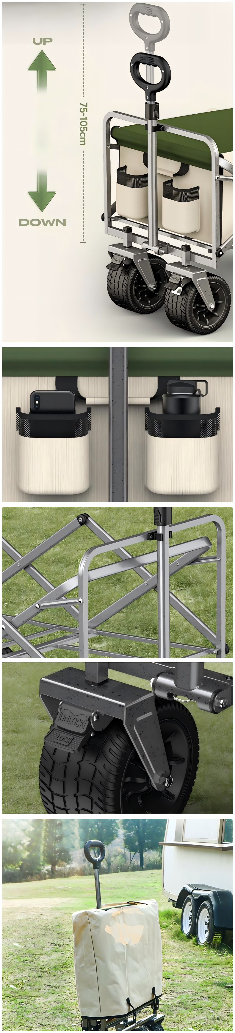 Designed with ergonomics in mind, it features a comfortable push-and-pull handle and large, wear-resistant wheels that smoothly navigate various terrains such as grass, sand, and dirt paths. The foldable structure allows for quick setup and compact storage, fitting conveniently in car trunks. Some models include cup holders and side pockets for extra storage, making it easy to carry small items.